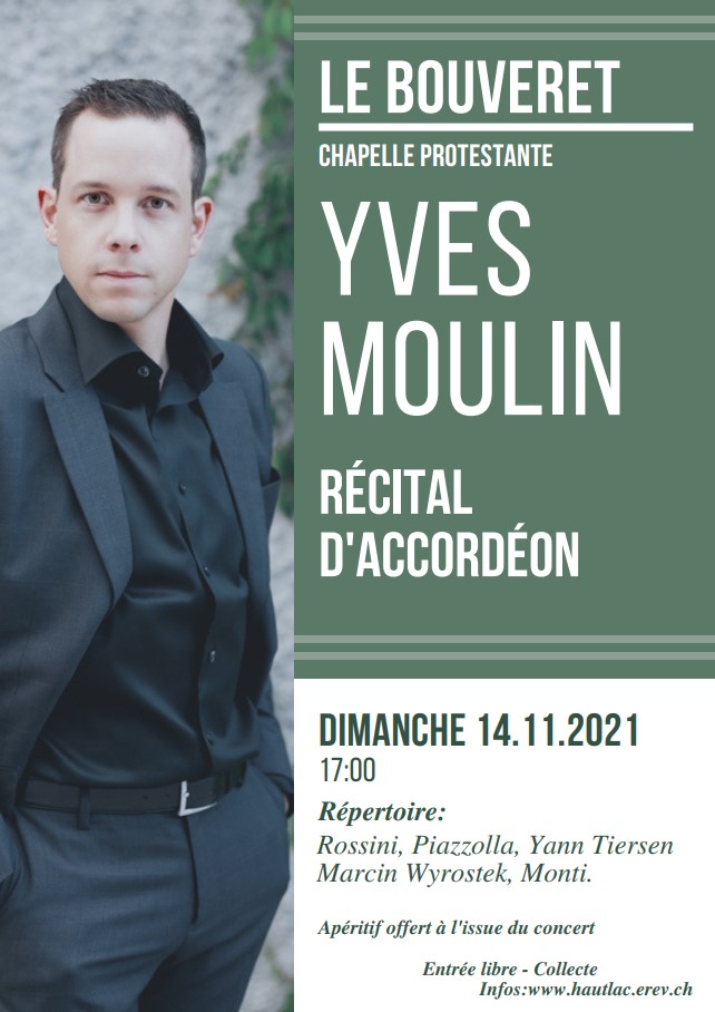 Récital d'accordéon par Yves Moulin Dimanche 14 novembre à 17h Chapelle protestante du Bouveret Entrée libre - Collecte Répertoire: Rossini, Piazzolla, Yann Tiersen, Marcin Wyrostek, Monti Apéritif offert à l'issue […]