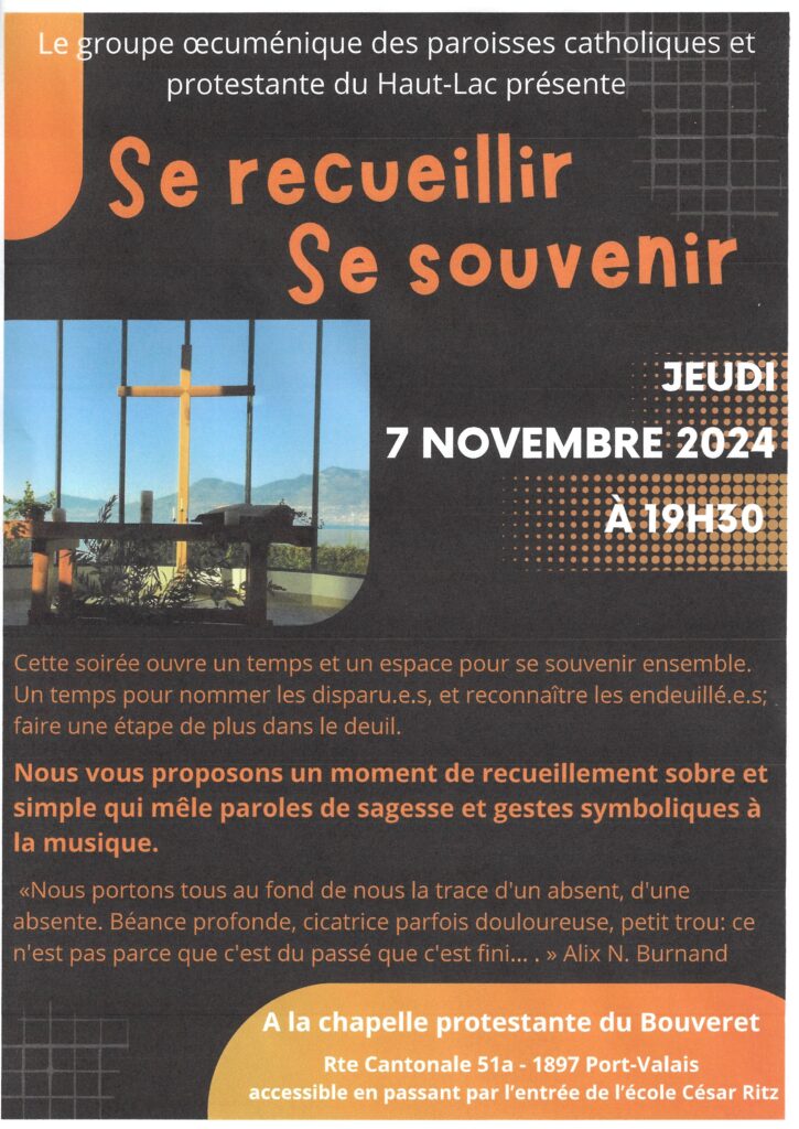 Le groupe oecuménique des paroisses catholique et protestante du Haut-Lac vous propose