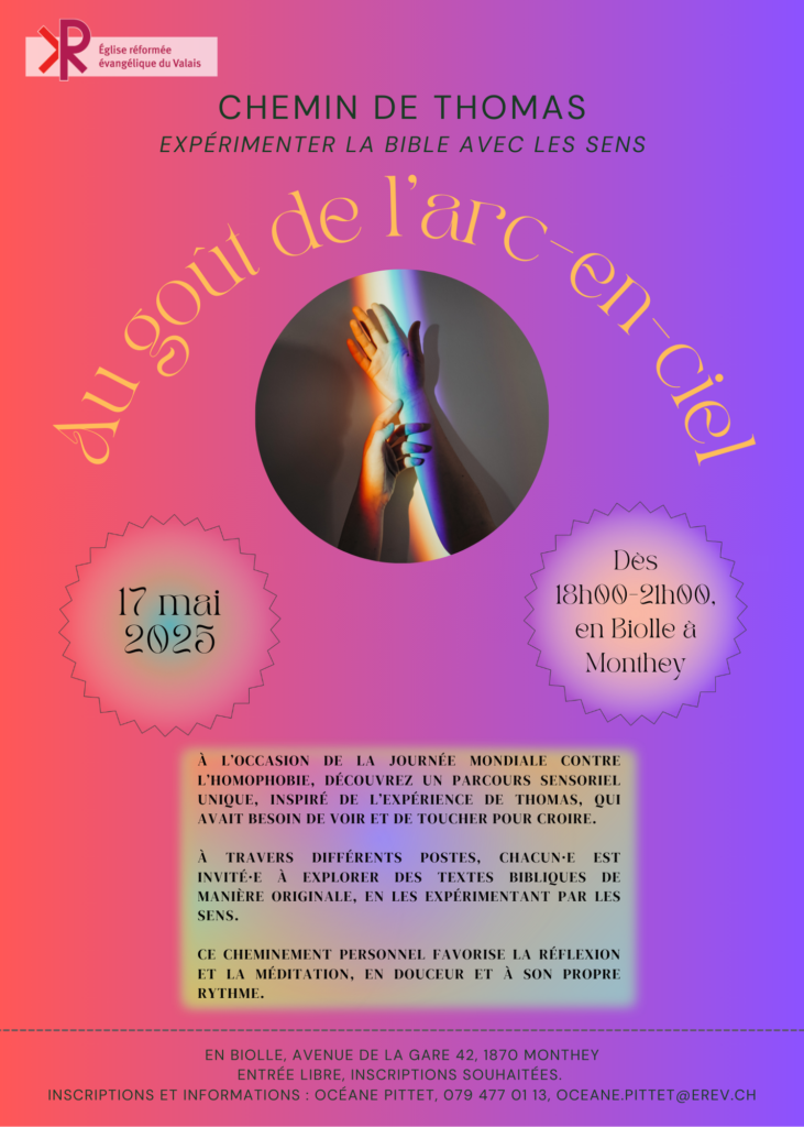 « Inspiré de l’expérience de Thomas, qui avait besoin de voir et de toucher pour croire, ce parcours sensoriel propose une approche originale et interactive des textes bibliques. À travers différents postes, chacun·e pourra expérimenter des textes par les sens, dans un cheminement libre et personnel.